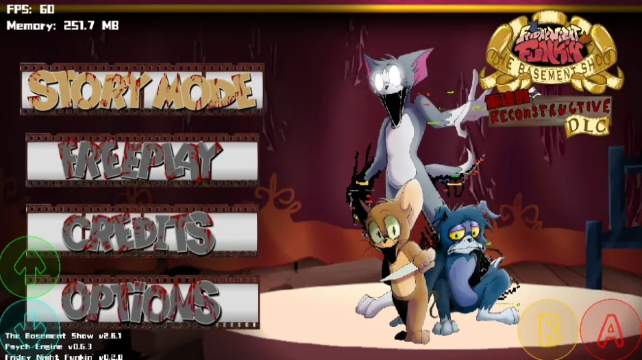 1、打开周五夜放克猫和老鼠地窖秀模组手机版,选择“STORTY MODE”点击右下角的A开始游戏。