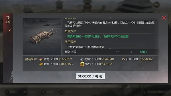 跨河打击必备!一般用于特殊战场,两军河口对垒。可以对桥对面发动类似国家策略强袭,无法占领,但可消耗耐久。调整后,布置时间为12小时,飞桥布置者可借助布置好的飞桥跨河出征并占领飞桥连接的土地,大大增加了战场战术准备,也多了很多新的可能。但是布置期间视野全开,这就要注意使用时机。改版后的飞桥相当于人造码头。