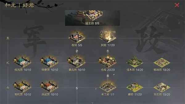 2. 多种资源:有木材、铁矿石料、粮草等资源,通过多种方式获取,用于城市建设与征兵。